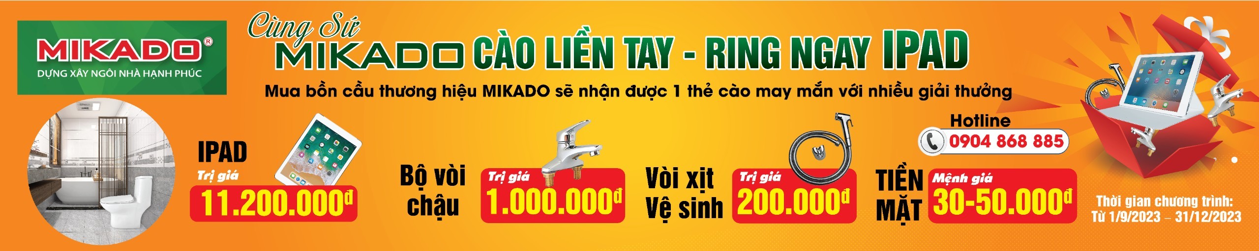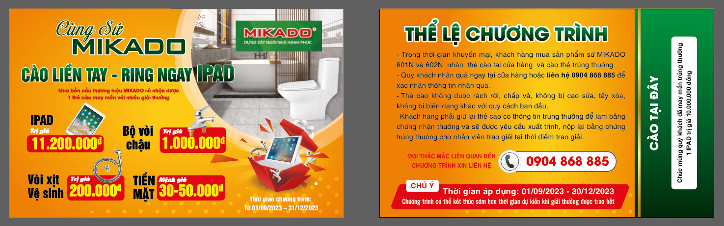 Trong thời gian diễn ra chương trình, khách hàng là người sử dụng cuối khi mua mỗi một sản phẩm bồn cầu của Mikado sẽ được nhận 01 thẻ cào chương trình “Cùng sứ Mikado cào liền tay – Ring ngay ipad”